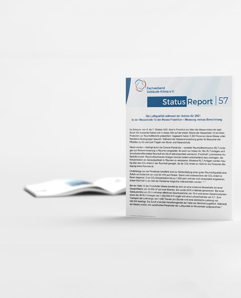 Während der Fachmesse Indoor-Air, die im Oktober 2021 unter Pandemie-Bedingungen in der neuen Halle 12 der Messe Frankfurt stattfand, wurden neben den 3G- und AHA-Regeln auch Raumlufttechnische Anlagen genutzt, um das Risiko der Übertragung von Corona-Infektionen deutlich zu reduzieren. Der Fachverband Gebäude-Klima e. V. (FGK) hat im Status-Report 57 eine Auswertung von Messungen und Berechnungen der Howatherm Klimatechnik GmbH zur Raumluftqualität in der Messehalle zusammengefasst. Die Messungen belegen, dass die Lüftung einen erheblichen Beitrag zur Reduzierung des Infektionsrisikos leisten kann.