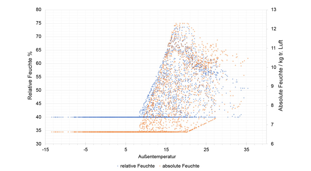 Relative und absolute Feuchte im Aufenthaltsbereich (jeder Punkt entspricht einer Stunde)