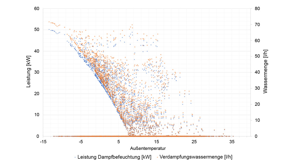 Die RLT-Anlage ist ausgerüstet mit einer Wärmerückgewinnung mit 75 % Temperaturänderungsgrad ohne Feuchterückgewinnung und mit Vorerhitzer, Kühler, Befeuchter und Nacherhitzer. Sie erfüllt die Anforderungen der aktuellen Ecodesign Verordnung EU 1253/2014 [4]. Die Befeuchter sind so geregelt, dass mindestens 40 % relative Luftfeuchte in der Aufenthaltszone eingehalten werden. Der Entfeuchtungsbetrieb über die RLT-Kühler erfolgt nicht feuchtegeregelt, sodass sich die Raumluftfeuchte ungeregelt aus der Zulufttemperaturregelung ergibt. In Abbildung 3 ist für jede Berechnungsstunde die relative und die absolute Feuchte im Aufenthaltsbereich dargestellt. Minimum ist 40 % oder 6,6 g/kg tr. Luft im Winter. Im Sommer ergeben sich maximal 10 bis 12 g/kg tr. Luft je nach notwendigem Kühlerbetrieb. Die Komfortgrenzen werden im Winter erfüllt und im Sommer knapp überschritten. Durch einen zusätzlichen geregelten Entfeuchtungsbetrieb ließen sie sich auch im Sommer einhalten. Da bei den Untersuchungen der Befeuchtungsbetrieb im Vordergrund steht, wird darauf verzichtet. Bei einem geregelten Entfeuchtungsbetrieb sind zusätzliche anlagentechnische Randbedingungen (z. B. Nacherhitzung) zu beachten. Zudem gibt es stärkere Wechselwirkungen mit den Raumlasten. Beispielhaft sind in Abbildung 2 die Befeuchtungsleistungen und die jeweils notwendige stündliche Wassermenge über der Außentemperatur dargestellt.