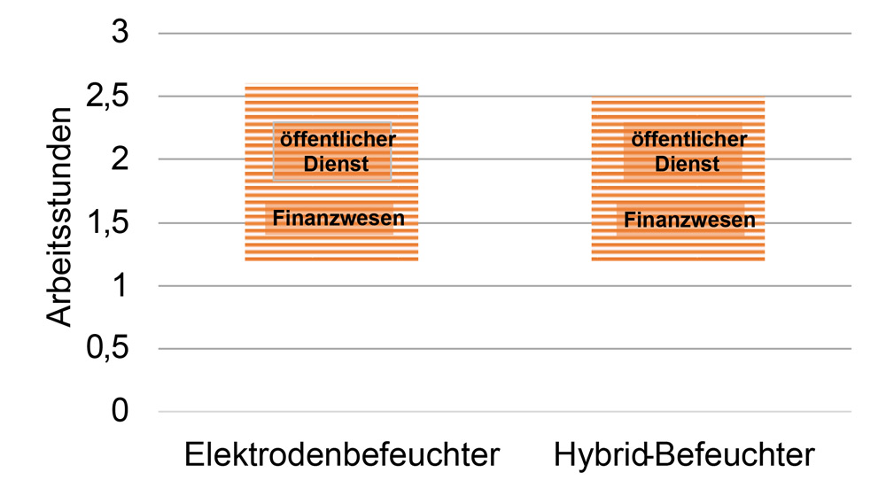 Diese Werte werden zu den in Tabelle 1 ermittelten Werten für die Bruttowertschöpfung je Arbeitnehmer und Fläche ins Verhältnis gesetzt. Für das Finanzwesen ergaben sich 36,9 € pro Tag und m² und für den Bereich öffentliche Dienstleistung 17,4 € pro Tag und m². Unter der Annahme, dass es aufgrund von Atemwegserkrankungen wegen zu geringer Luftfeuchte zu 1,5 Ausfalltagen pro Jahr kommt, ergibt sich im Fall des Finanzwesens ein Ausfall der Bruttowertschöpfung von 55,35 € pro Tag, in der öffentlichen Dienstleistung sind es 26,1 € pro Tag. Aus dem Verhältnis zwischen der Bruttowertschöpfung der Mitarbeitenden und den Kosten für die Befeuchtung kann direkt abgeleitet werden, dass sich ein Befeuchtungssystem bereits lohnt, wenn damit wenige Stunden an Arbeitsausfall vermieden werden (Abbildung 4). Die Betrachtungen zeigen, dass der Ausfall an Bruttowertschöpfung eines halben Arbeitstags bereits höher ist als die jährlichen Kosten für Anschaffung und Betrieb eines Befeuchtungssystems. Je nach Branche und Befeuchtungssystem liegt die Zeit bei weniger als 1,5 Stunden.